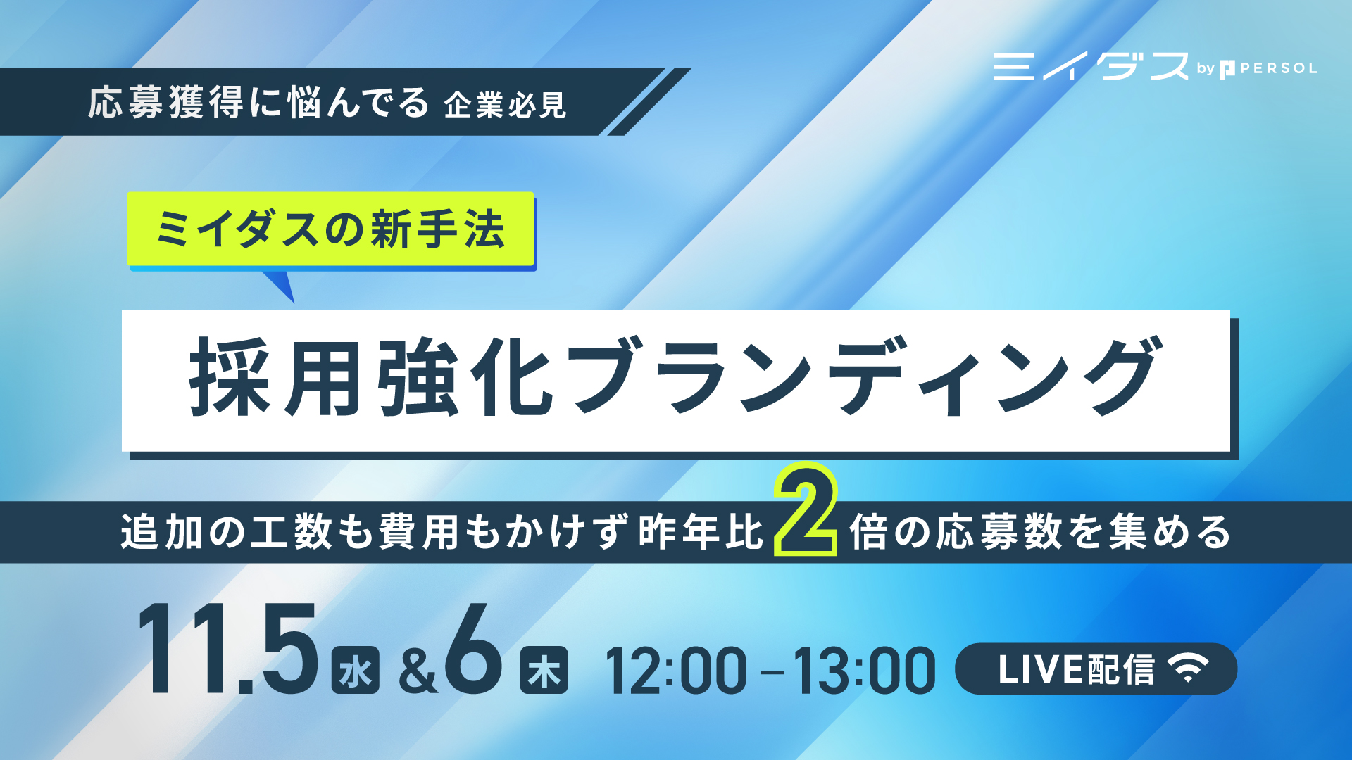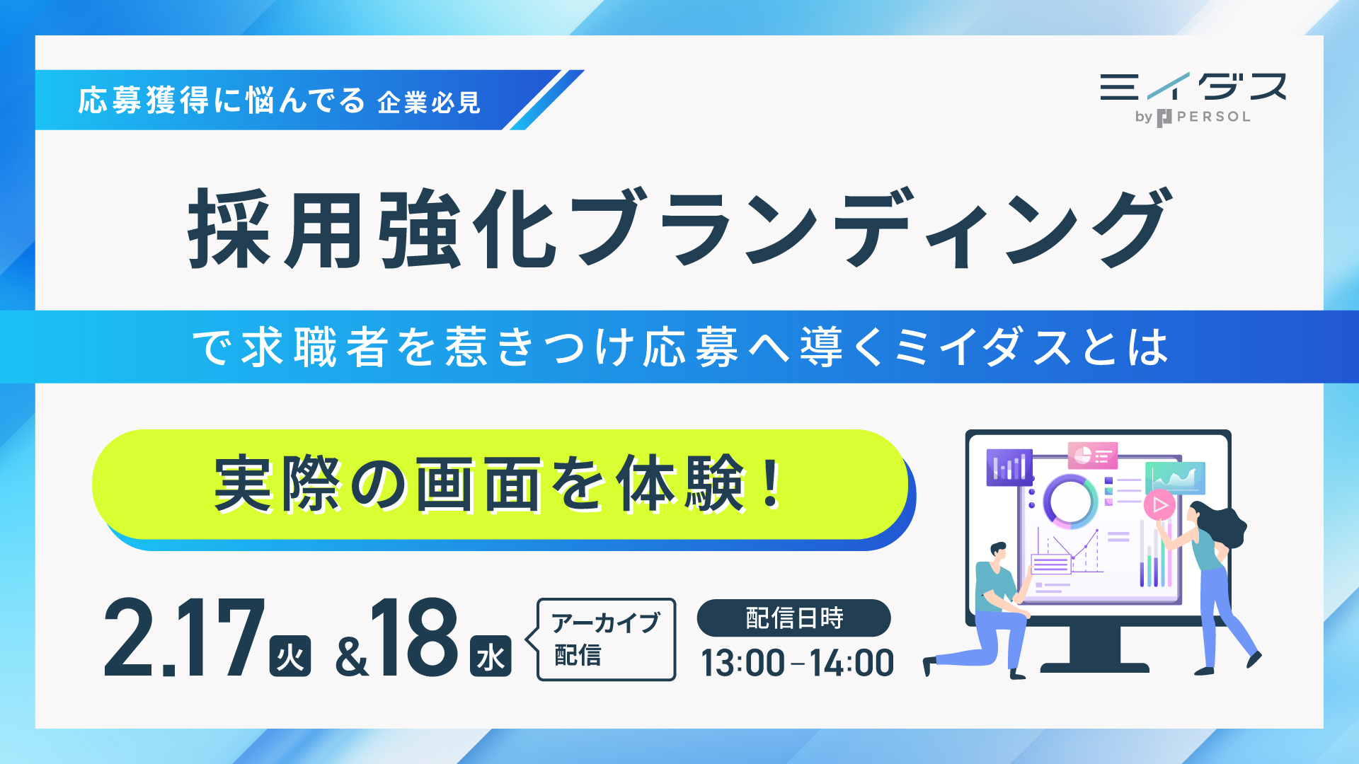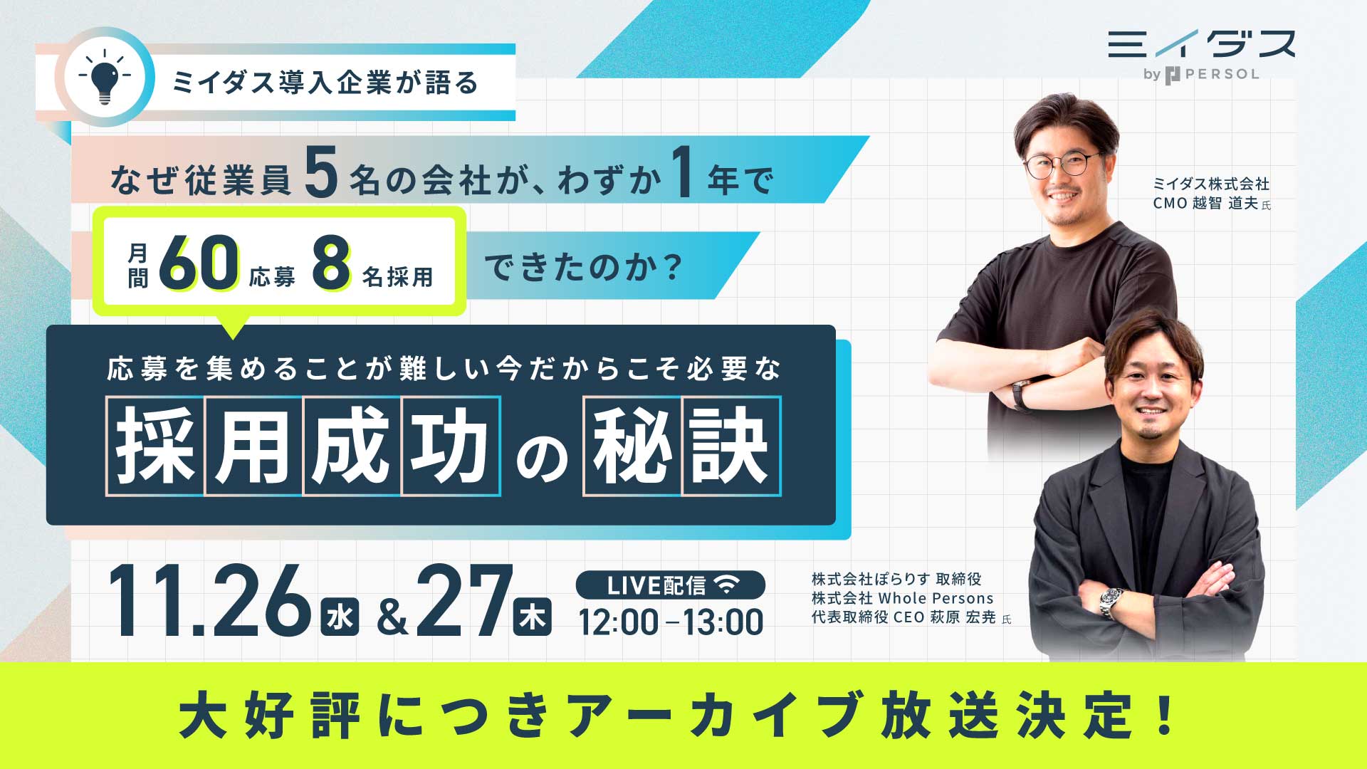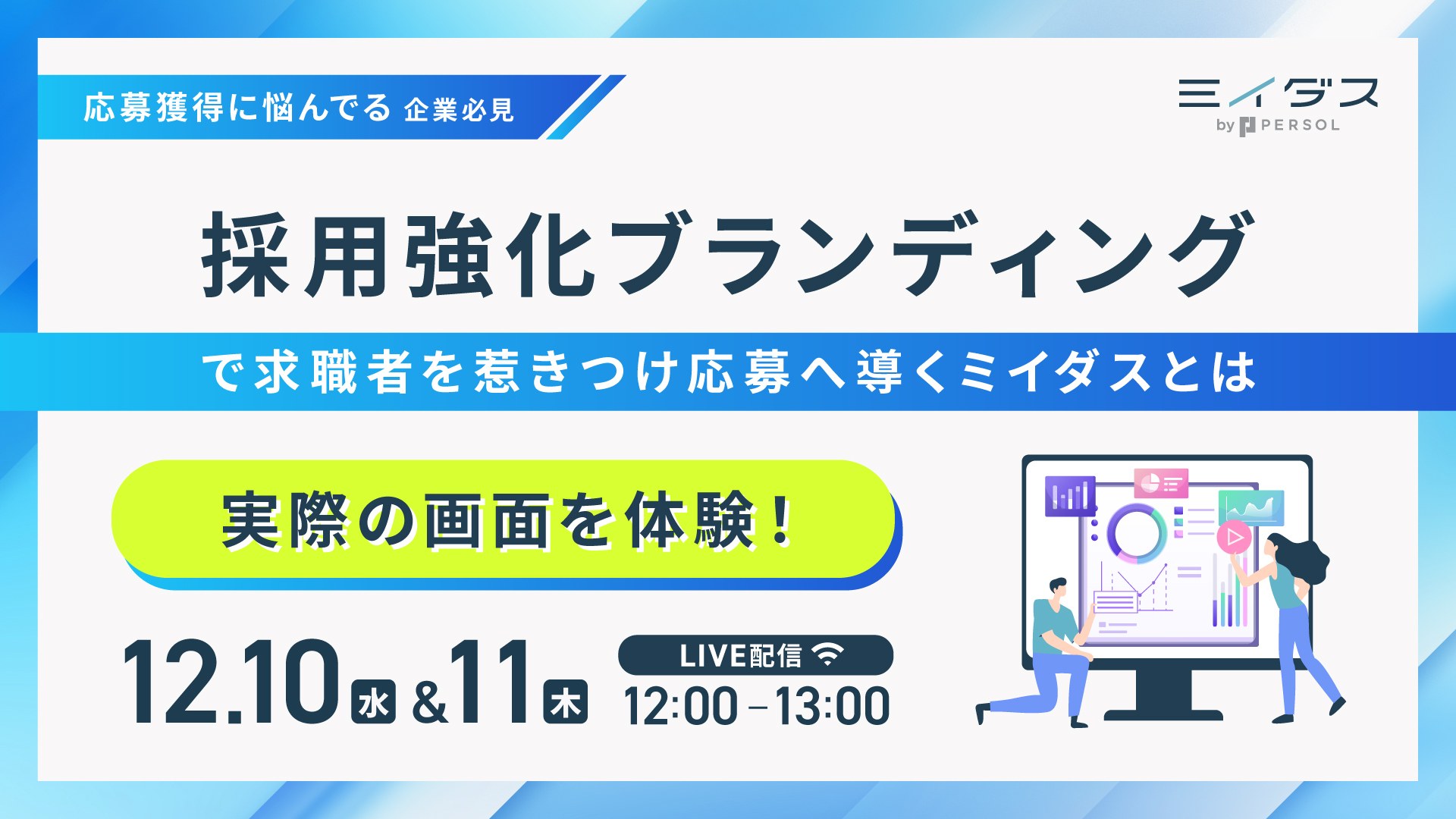受付終了 【アーカイブ配信】社員5名の会社が、なぜわずか1年で月間60応募を集め8名も採用できたのか?ミイダス導入企業が語る、応募を集めることが難しい今だからこそ必要な採用成功の秘訣とは 日時: 2025/11/26(水)12:00〜13:00 金額: 無料 場所: ZOOM ミイダス紹介ウェビナー 採用