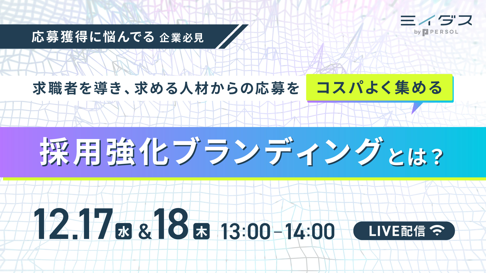 受付終了 【求人応募で悩んでる企業必見】追加の工数も費用もかけず、昨年比2倍の応募数を集めたミイダスの新手法「採用強化ブランディング」を大公開! 日時: 2025/9/3(水)12:00〜13:00 金額: 無料 場所: ZOOM ミイダス紹介ウェビナー 採用 採用ブランディング